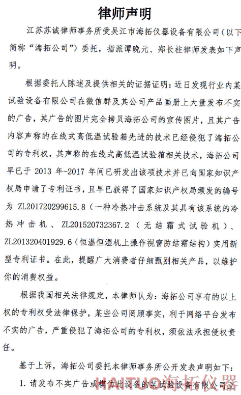 海拓儀器律師聲明:反對侵權行為 維護公司和消費者權益摘要:國內(nèi)試驗設備領先者吳江市海拓儀器設備有限公司委托律師事務所發(fā)布了律師聲明,該聲明指出,當前市面上出現(xiàn)了產(chǎn)品專利侵犯海拓儀器權益,海拓儀器將以法律手段維護自身利益。該律師聲明要求某試驗設備有限公司立即停止侵權行為,扯下其在網(wǎng)絡平臺的相關廣告和宣傳畫冊并同時停止生產(chǎn)同款設備。如果該設備公司不聽勸解,海拓儀器將向人民法院依法起訴該公司侵權行為,以維護自身合法權益和維護客戶消費權益,并建議廣大消費者仔細甄別相關產(chǎn)品。? ? ? ?近日,吳江市海拓儀器設備有限公司委托律師事務所發(fā)布了律師聲明,該聲明指出,當前市面上出現(xiàn)了產(chǎn)品專利侵犯海拓儀器權益,海拓儀器將以法律手段維護自身利益。??事件源起于海拓儀器發(fā)現(xiàn)市面上有同類設備公司通過完全拷貝海拓儀器產(chǎn)品宣傳圖片,在微信群及該公司產(chǎn)品畫冊上大量發(fā)布不實廣告。??聲明指出,該廣告聲稱的在線式高低溫試驗箱的技術侵犯了海拓儀器的專利權,該產(chǎn)品專利由海拓儀器